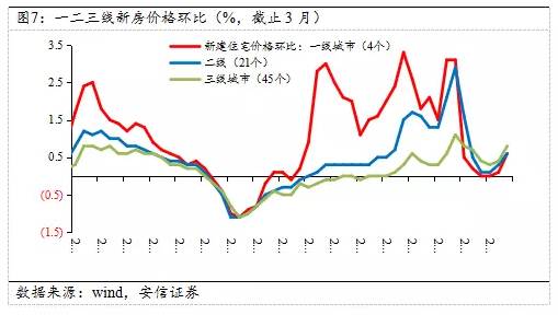 新房市场上,3月一二三线环比同步走高,平均环比0.7%,显著高于1-2月。三线涨幅继续超过一二线。这些特征与微观层面的反馈是一致的(图7)。