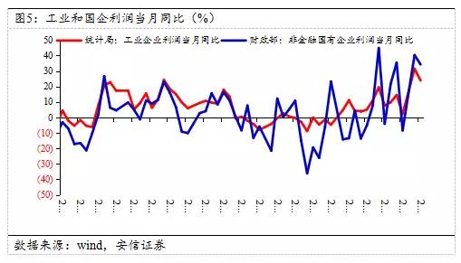 近日统计局、财政部分别公布3月工业企业和国有企业经营数据(图5)。当月工业企业利润同比增长24%、国有非金融企业利润同比增长34%,较1-2月有所回落,但仍处在极高的水平上。4月以后,考虑到价格的继续走低及价格变化对利润数据的显著影响,利润同比增速可能阶段性回落,但持续性也许有限。