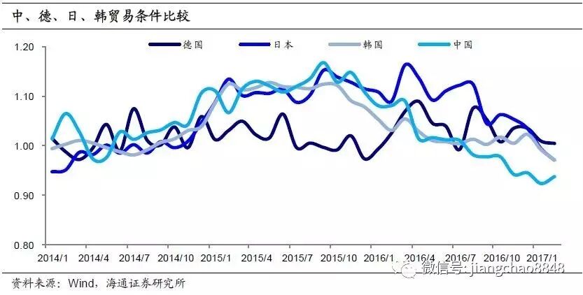 16年以来我国贸易条件出现了不利的变化。外贸中通常将出口价格与进口价格之比作为贸易条件,用来衡量出口相对于进口的盈利能力,而进口价格上涨快于出口价格则意味着贸易条件的恶化。比较中、德、日、韩的贸易条件发现,16年开始我国的贸易条件快速下降,16年8月就已降到1以下,17年进一步降至0.93,同一时期虽然德、日、韩等国贸易条件也在下降,但至今仍在1左右,下降幅度远小于中国。