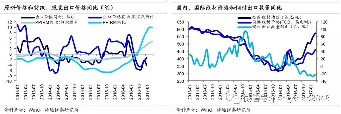 上游原料飙涨、国内成本抬升,对出口的回升形成拖累。出口改善较慢的服装、纺织等附加值低,并且受国内上游原材料价格影响大。16年下半年,我国纺织原料购进价格同比转正,17年前三个月加速上行到4.6%,PPIRM整体更是同比飙升至10%。因此在近半年纺织服装出口价格低迷的情况下,上游过高的成本便对出口进一步形成拖累。钢材出口的大幅缩减也与价格有关。在去产能背景和工业需求稳定之下,近半年国内钢材价格强势拉升,持续高于国际市场,因而出口大受挫伤,已经连续4个月出口数量同比下降20%以上。