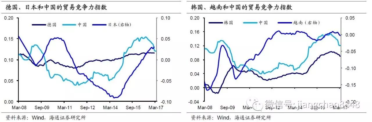 贸易竞争力的下降,反映了进出口增速失衡的问题。17年以来我国、韩国和越南的进口金额累计同比增速都达20%以上,显著高于日本和德国,并且从金额上看,进口累计同比增速也高于出口累计同比,一定程度上挫伤了贸易竞争力。17年2月以来韩国和越南的出口金额累计同比增速均在15%左右,而进口累计增速却超过20%。而我国的问题更为严重,一季度出口金额同比增速8.2%,而进口金额同比高达24.1%。