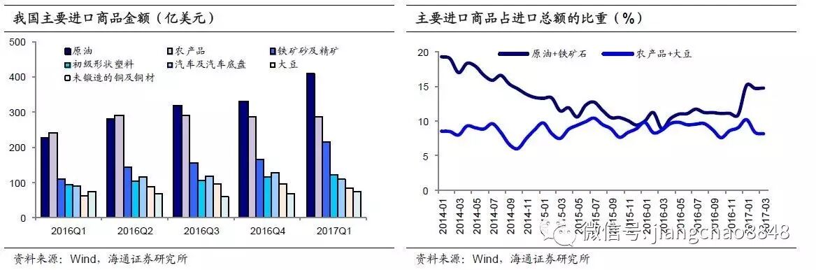 17年一季度我国进口额同比高增24.1%,原油和铁矿石等大宗商品进口大幅跳升。农产品、能源、上游原材料等是我国主要的进口商品。其中原油和铁矿石17年来进口增加最多,一季度进口金额同比分别增长81%和98%,合计占进口总额的比重也从16年底的11%跳升至15%,而农产品和大豆占进口的比重则相对稳定。