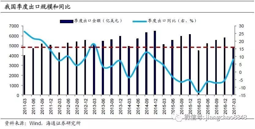 与此同时,我国3月出口也有明显回升,但整体而言一季度的出口规模并不算高。由于存在春节因素,年初各月出口增速波动往往较大,按季度看,17年1季度出口总额同比8.3%的增速较去年明显改善,但绝对规模上,一季度4834.2亿美元的出口额仍低于14、15年同期水平,可见一季度出口的回升与15-16年全球贸易萎缩的低基数不无关系,全球贸易也尚未完全摆脱低迷。