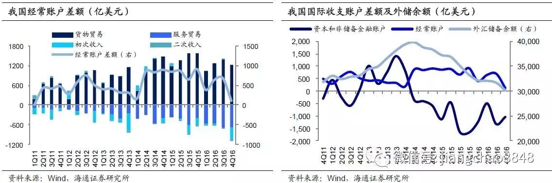 从国际收支来看,贸易顺差下降也使得经常账户差额降至近年新低。16年4季度,我国货物贸易顺差较15年4季度减少366亿美元,服务贸易逆差保持扩大趋势,而初次收入对外金融资产的投资收益又季节性增加,导致经常账户差额仅有118.1亿美元,是11年2季度以来的最低水平。我国进入经常账户顺差和资本及金融账户逆差的时代已有三年,外汇储备也从4万亿的高位降至3万亿左右,因而经常账户差额的大降比以往更值得注意。