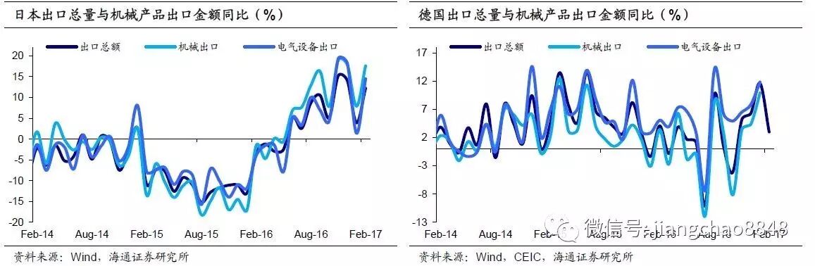 另一方面,日、德等制造业传统强国的机械类出口复苏强劲,依然占据优势。日本和德国出口产品以技术密集型为主,日本机械设备产品占总出口的比重达38%,而德国机械电气和运输设备分别占总出口的27%和23%,16年下半年日本机械类出口连续高增,一度高达18%,德国的电气设备出口额同比17年初也回升到12%。