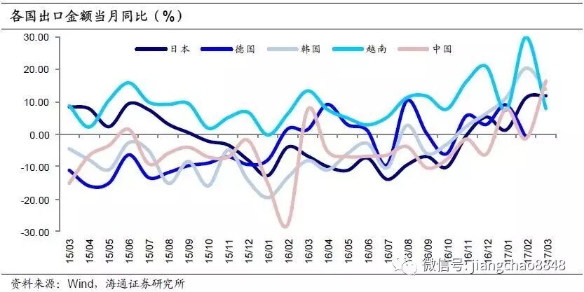 然而我国的出口回暖却相对偏弱,整体上我国的出口改善幅度不及其他经济体。16年下半年,全球贸易出现改善迹象。越南的出口增速16年2月起就一直为正,17年2月出口金额同比甚至高达29.8%,反映了其出口的相对景气。作为主要的出口型经济体,韩国、日本的出口增速同样快速回升,于去年10月、11月相继转正。而得益于欧元弱势,16年下半年德国出口也维持增长。相比之下,我国的出口额同比直到17年1月才转正,并且回升幅度也明显弱于其他经济体。