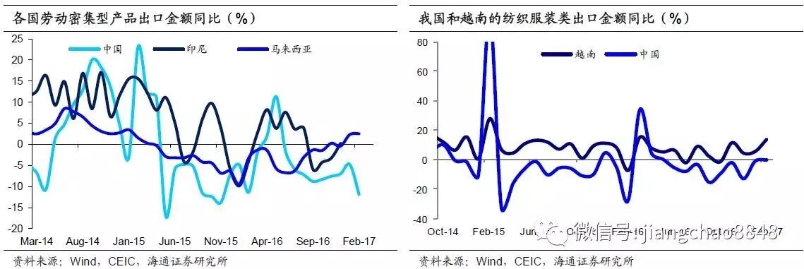 在这过程中,东南亚国家对我国的劳动密集型产品出口形成替代和挤出,使得纺织服装等传统的劳动密集型出口改善偏弱。越南、印度、印尼等国家具备劳动力成本更低的优势,是劳动密集型产业转移的主要去向,跟我国同类出口产品形成竞争。过去的一年,国内上游原材料飙涨进一步推高了成本,部分劳动密集型产品出口优势减弱,而东南亚国家劳动密集型产品的出口额同比却率先转正,越南的纺织服装出口17年1-2月同比甚至在13%以上,远超中国同期的出口增速。