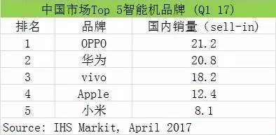 ▲IHS Markit公布的第一季度国内智能机销量情况