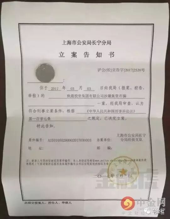 投资人提供的立案告知书显示,投资人于2017年3月3日向上海市公安局长宁分局经侦支队举报快鹿集团涉嫌集资诈骗一案,经审查认为符合刑事立案条件,根据《中华人民共和国刑事诉讼法》第一百零七条规定,已决定立案。同时,东虹桥担保也同样被立案。