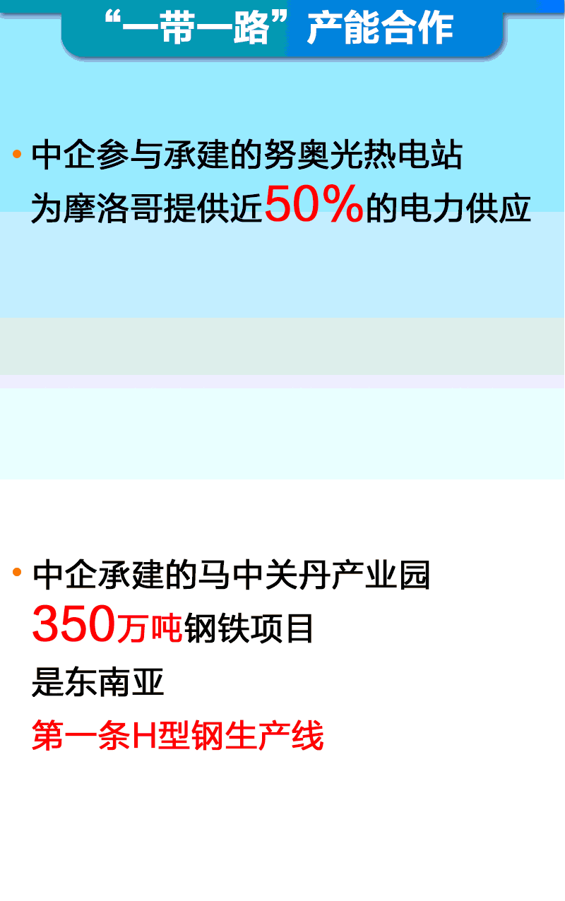 这方面的例子不胜枚举。中国公司参与承建的努奥光热电站项目,让摩洛哥超过100万的家庭将用上清洁能源;承建的吉布3水电站,让埃塞俄比亚告别了电力短缺的历史;承建的马中关丹产业园350万吨钢铁项目,成为马来西亚政府加快现代钢铁行业发展的重要安排。