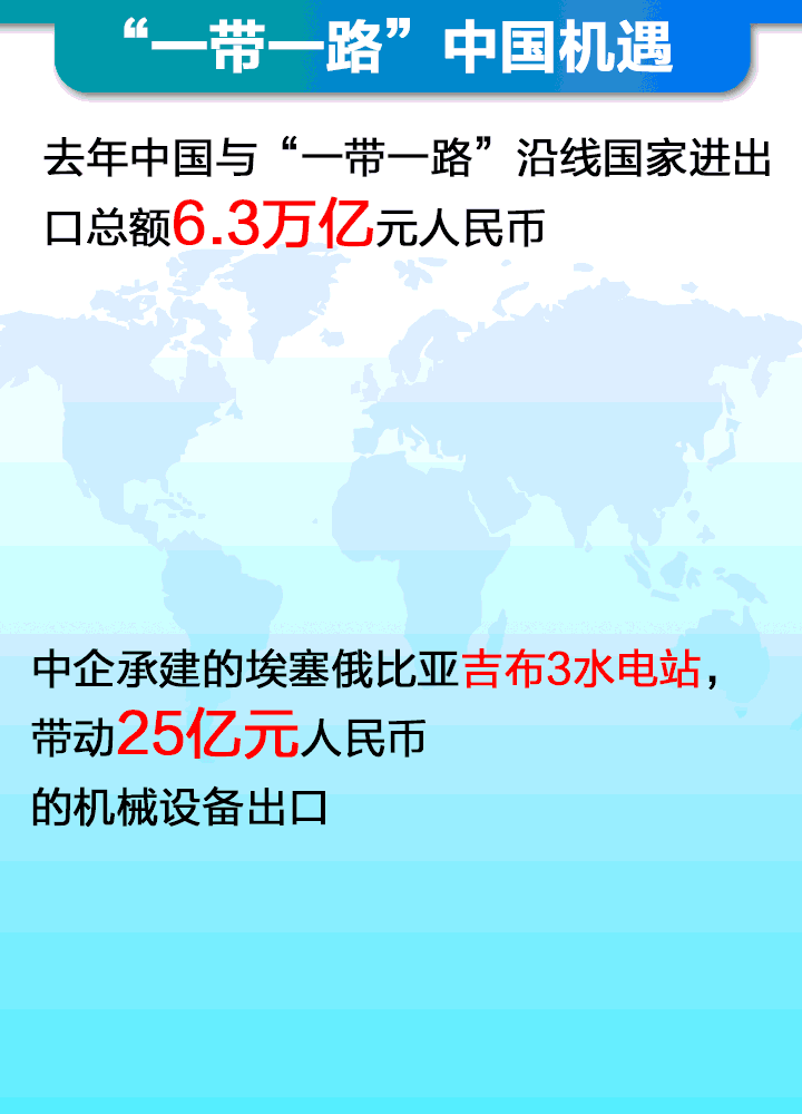 中国公司在“一带一路”建设中实现了更大步伐的“走出去”。比如,中国公司参与承建的摩洛哥努奥光热电站项目,带动国内包括电器厂、钢结构等在内的下游企业200多家海外发展及设备出口,承建的埃塞俄比亚吉布3水电站,带动了25亿元人民币的中国机械设备出口。
