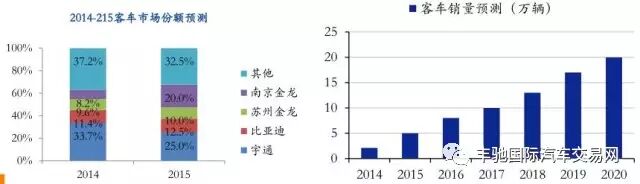 市场空间:2014年客车市场销量2.1万辆,市场推广来自三大动力:地方政府推广压力的直接传导、公交燃油补贴向新能源公交倾斜、新商业模式的带动。我国采用商用带动乘用的发展路线,预计到2020年,新能源客车年销量将达到20万辆;