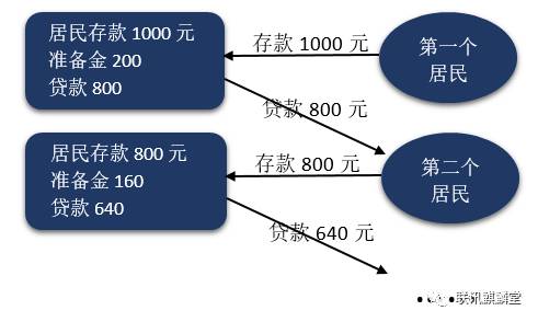 在银行体系中,银行的准备金由法定存款准备金和超额存款准备金决定,假设市场中的准备金率为20%(10%的法定准备金和10%的超额准备金),中央银行发行1000元给第一个居民,他将所有现金存入第一家银行,银行留下法定准备金200(1000*20%),将剩余的800元(1000-200)现金贷款给第二个居民,第二个居民将800元存入第二家银行,银行留下法定准备金160元(800*20%),将剩余的640元(800-160)贷款给第三个居民,此时货币市场中的货币总量是2440元(1000+800+640),整个存款贷款过程不断往复,经过银行系统的1000元,最终会创造出5000元(1000/20%)的流通货币,货币乘数是5倍(1/20%)。