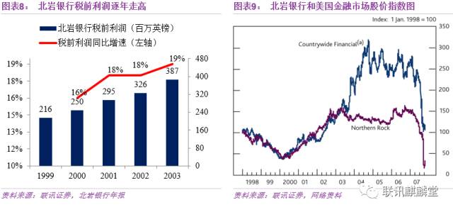 1999年到2003年北岩银行税前利润逐年增长,持续保持在15%以上,甚至高达18%,股价指数增长三倍,在后期跑赢了金融机构大盘指数【图表9】。