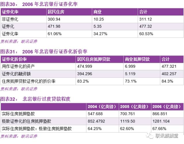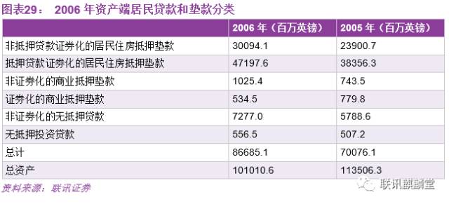2006年北岩银行负债端住房抵押贷款证券化和担保债券总额是464.28亿英镑,资产端证券化的居民住房抵押垫款总额471.98亿英镑,分别占总负债(总资产)的45.96%和46.73%。
