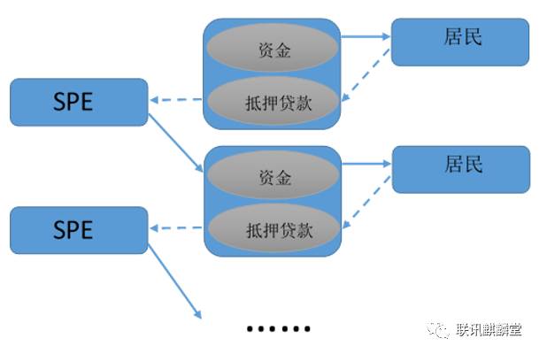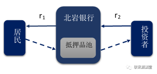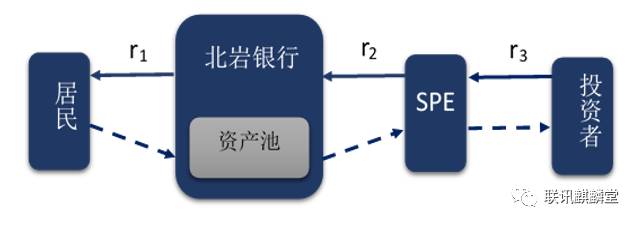 具体做法是北岩银行用利率r1借钱给居民买房,将没有证券化的住房抵押贷款分配给SPV(special purpose vehicle),成立“抵押品池”,以利率r2发放抵押贷款担保债券给投资者,这时抵押贷款担保债券中的利率关系是:r1> r2>银行长期存款利率。