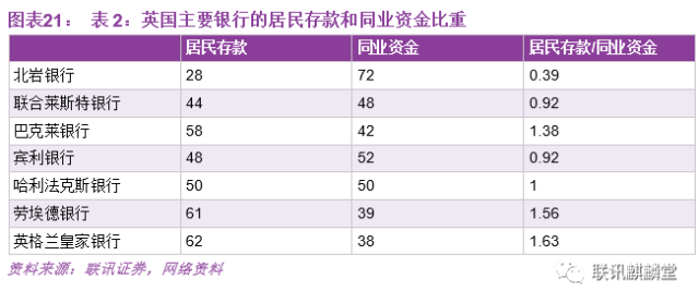 我们以当时英国较具代表性的几家银行为对比标的。仅考虑居民零售存款与同业资金,计算出居民零售与同业资金分别占两者之和的比重,然后相除得到居民存款/同业资金的比例。