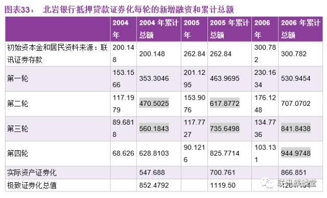 我们将测算细化,发现,2004年和2005年北岩银行大概经过3轮证券化,2006年北岩银行经过4轮证券化。2006年年北岩银行实际证券化的住房抵押贷款总额是866.85亿英镑,处于第三轮和第四轮证券化累计值之间,可见2006年北岩银行进行了4轮抵押贷款证券化。并将其筹集到的资金用来放贷。