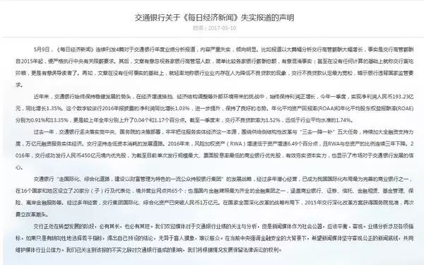 交通银行称,文章在没有任何事实的基础上,就轻率地称银行业业内存在人为降低不良贷款的现象,交行不良贷款认定最为宽松,暗示银行违背国家监管要求。