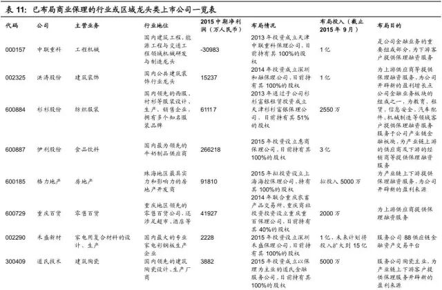 (3)政策支持与上市公司参与情况:政策春风不断,上市公司抢跑布局。前文已经在图8中列出我国政府自2009年以来对商业保理的各项支持政策,而预计年内将会出台的《商业保理企业管理办法》更会将政策支持力度提高到新的层面。在政策春风不断的背景下,我们发现2012年以来已经先后有34家先知先觉的上市公司(包含在沪深股市、香港股市及美国纳斯达克市场上市的所有中国公司)开始布局商业保理,抢跑供应链金融蓝海市场以期获得先发优势。是特别是2015年以来,止上市公司投资商业保理的热情激增,截止9月月30日增已新增17家境内外上市的中国公司投资布局商业保理,市场关注度正在快速升温。