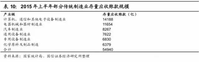 根据国家统计局公布的2015年上半年数据,传统制造业(包括计算机、通信和其他电子设备制造、电器机械和器材制造、汽车制造、通用及专用设备制造等)、材料工业(包括化学原料及制品等)和大宗商品(包括金属及部分非金属制品、煤炭开采和选洗等)是商业保理潜在市场规模最大的产业。