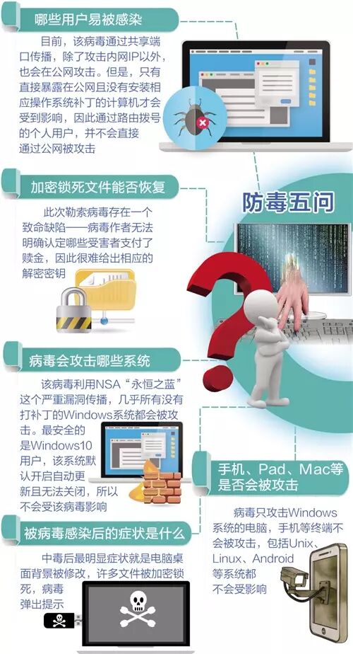 针对这一“勒索病毒”,中央网信办网络安全协调局负责人表示,几天来应对该勒索软件的实践表明,对广大用户而言最有效的应对措施是安装安全防护软件,及时升级安全补丁,即使是与互联网不直接相连的内网计算机也应考虑安装和升级安全补丁。作为企业的系统管理技术人员,还可以采取关闭该勒索软件使用的端口和网络服务等措施。