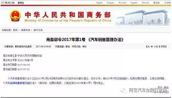 2017汽车销售管理办法完整全文解读,7.1实施详解。《汽车销售管理办法》已经2017年2月20日商务部第922次部务会议审议通过,现予公布,自2017年7月1日起施行。经商发展改革委、工商总局同意,《汽车品牌销售管理实施办法》(商务部、发展改革委、工商总局令2005年第10号)同时废止。