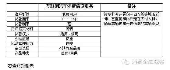相较于上述商业银行、汽车消费金融公司提供的汽车消费信贷服务,目前的互联网汽车消费信贷服务商具有以下特点: