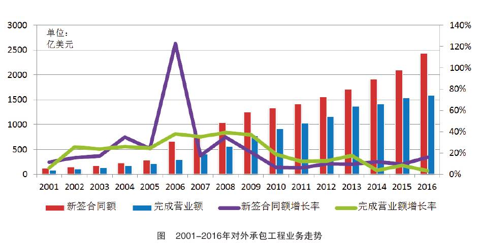2016年我国对外承包工程完成营业额1594.2亿美元,同比增长3.5%;新签合同额2440.1亿美元,同比增长16.2%。截至2016年底,我国对外承包工程已累计完成营业额1.2万亿美元,新签合同额1.7万亿美元。2016年,全球经济增长依然缓慢,能源资源价格维持低位,非洲、拉美等资源型国家财政收入减少,基建投资增长乏力,贸易保护主义抬头,内外竞争加剧,国际承包工程市场整体表现低迷。在此大背景下,我国对外承包工程行业攻坚克难,紧跟国家“一带一路”建设和国际产能合作指引,多种举措加大市场开拓力度,取得了难能可贵的成绩,行业整体业务稳步攀升。