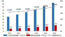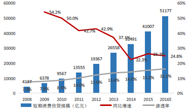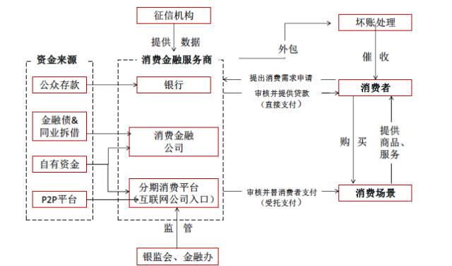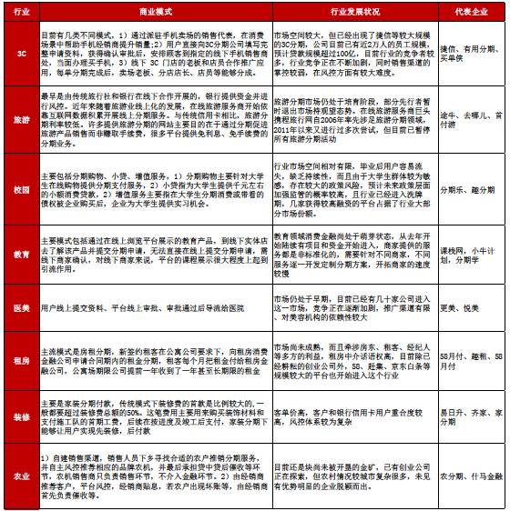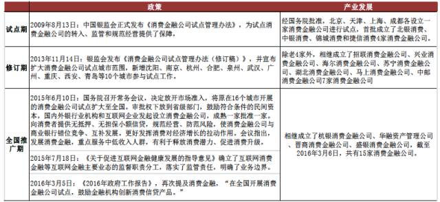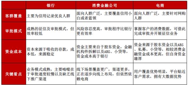 1、政策利好,行业发展正当时 1.1消费金融场景不断丰富,对比发达国家市场前景广阔 1.2政策红利不断释放,地域与参与主体限制逐渐放开 1.3产业资本进入,推动行业进入爆发式增长阶段 2、多方势力角逐,竞争逐渐加剧 2.1两大模式,三方势力的格局基本成型 2.2商业银行与产业资本共同抢滩消费金融市场 2.3掌握流量入口,电商系占据线上消费场景制高点 3、深耕垂直场景,风控是下一阶段竞争核心 3.1细分市场仍未饱和,线下场景成竞争焦点 3.2蓝领市场正逐渐兴起,3C分期与现金贷最具空间 3.3流量为王已是过去式,2.0时代得风控者得天下 4、投资逻辑:把握场景与风控两大主线 1、政策利好,行业发展正当时 1.1 消费金融场景不断丰富,对比发达国家市场前景广阔 随着产业发展与技术创新,消费金融正在从传统的高收入人群和大额低频次消费场景向中低收入人群及小额高频次消费场景迅速拓展。传统消费金融主要专注于买房、购车等大额低频次消费场景,且用户大部分为净值较高人群,对学生、农民、蓝领等收入较低人群则覆盖较少。随着近年移动互联网的快速发展以及大数据征信技术的创新,消费金融正在向大众的日常生活快速渗透,目前正在向大学生、蓝领群体等以及3C 数码产品、旅游、餐饮等小额高频次消费场景迅速拓展。 我国住房贷款占消费性贷款之比高达75%,除去房贷与车贷后居民消费信贷占比远低于国外平均水平。根据中国人民银行数据显示,2014 年我国消费性贷款规模达到15.38 万亿,2015 年达到约18.96 万亿,基本维持20%以上的年复合增速。国内居民消费信贷占总的全国信贷之比为20%,其中有将近75%是住房贷款,除去房贷和车贷后居民消费信贷占比仅5%,远低于国外成熟市场平均30%的比例。预计未来随着人群代际的变迁、居民收入的持续增长下、消费观念转变、消费金融产品及服务不断丰富下,国内居民消费信贷(除房屋贷款)具备很大的提升空间。 目前国内消费信贷余额接近20亿元 从我国短期消费信贷情况来看,2015 年我国个人短期消费贷款约为4.1 亿元,同比增长26.2%,占总消费支出之比达到15.5%。而美国的消费信贷占消费支出之比远超我国水平,近年稳定在27%左右。在过去几年内,无论是信贷结构还是消费模式上,我国消费信贷渗透率都以线性方式快速上涨(在2008 年我国短期消费信贷仅占7.3%),且预计在未来5 年左右有望达到美国的水平,总体来看我国的短期消费信贷市场仍存在较大的发展潜力。 我国短期消费信贷占比快速提升 1.2 政策红利不断释放,地域与参与主体限制逐渐放开 消费金融政策红利不断释放。从政策层面来看,2016 年将成为互联网金融监管元年,尤其是2015 年以来P2P 爆发出来的重大风险使得监管已经大幅趋严。与2015 年两会中提出“大力发展普惠金融”相比,2016 年两会提议更多趋向行业立法和政策监管。在互联网金融加强监管的同时,大力鼓励消费金融的发展则成为另一个主旋律。在2015 年6 月,国务院常务会议决定放开消费金融的市场准入,2015 年11 月,国务院发布《关于积极发挥新消费引领作用加快培训新供给动力指导意见》,将消费金融公司试点范围推广到全国, 从最高层面为消费金融释放出了巨大的积极信号与政策红利。 从我国政策的变化路径来看,消费金融的试点城市以及参与主体都在不断放开。2009 年,我国宣布在北京、天津、上海、成都启动消费金融公司试点审批程序,次年,银监会相继批准北银、中银、四川锦程和捷信四家消费金融公司挂牌成立,进一步扩大了试点城市的范围。2013 年,消费金融公司准入门槛放宽,试点范围进一步扩大。2014 年京东白条和天猫分期推出,且许多互联网消费金融产品开始出现,参与主体不断丰富。2015 年6 月,国务院召开常务会议,决定将消费金融公司试点扩大至全国,放开市场准入,鼓励设立消费金融公司,在政策红利的释放下,行业进入了快速发展阶段。 1.3 产业资本进入,推动行业进入爆发式增长阶段 除了传统银行成立消费金融公司布局市场以外,包括BAT、京东、苏宁在内的互联网及产业巨头正在积极介入。阿里巴巴蚂蚁金服为方便消费者的在线购物,相继推出蚂蚁“花呗”“借呗”等产品;京东金融推出了覆盖多个门类的“京东白条”,中国电信甜橙金融推出了“甜橙小贷” “甜橙白条”等服务。 2016年消费金融融资次数仅次于P2P 2016年消费金融融资轮次集中在天使轮 从16-17 年消费金融行业投融资项目情况来看,获得融资的机构数量及额度均大幅增长,包括趣店、易生、乐信等多家公司均获得数亿美元级别的大额融资。同时针对不同细分人群和不同应用场景的创新产品不断推出,面向大学生、蓝领、农民以及针对旅游、教育、3C 等领域的现金贷和消费分期产品不断涌现。 2、多方势力角逐,竞争逐渐加剧 2.1 两大模式,三方势力的格局基本成型 消费金融目主流模式主要有消费分期和现金贷两种,分别涉及到消费者、商户和贷款公司三方以及消费者和贷款公司两方。消费分期主要基于真实的消费场景,消费者在商户进行消费,申请贷款或分期,贷款资金支付给提供商品或服务的公司,客户可以选择分期还款。现金贷则是纯线上操作,由消费者向消费金融公司申请贷款,完成审核后,贷款资金直接发放给消费者。 1)消费分期:最早是建立在商业银行在传统消费场景上建立的赊账消费业务,