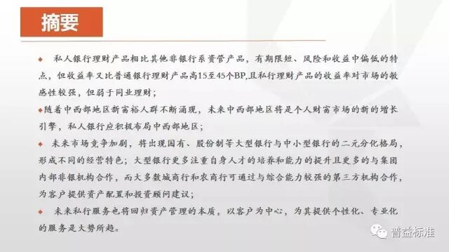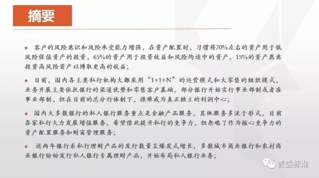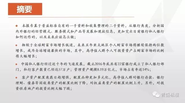本报告从银行角度,分析国内外银行的经营模式、服务模式和产品等发展和现状信息,更加突出目前银行私人银行如何运作的,以及未来应该怎么做。