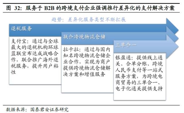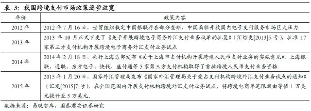 来源:来源:国泰君安证券研究 需求+政策驱动,跨境支付迎来发展机遇。传统国际贸易中间交易环节的复杂性催生了跨境电商发展,在这个过程中第三
