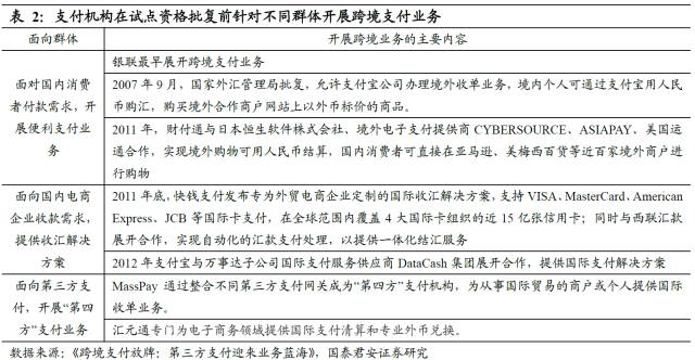 部分企业尝试跨境支付,面对不同群体拓展各类型业务。在跨境支付 试点资格批复之前,多家互联网支付机构分别针对面向个人消费者、 电商平台和第三方支付机构同业的跨境支付业务,在政策落地之前跨 境支付行业的发展趋势已初露迹象。