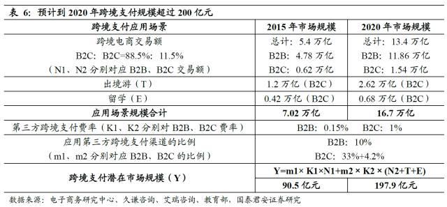 应用场景扩容+盈利模式多样化,保守估计市场容量有望接近 200 亿 元。当前跨境支付的主要应用场景集中在跨境电商、跨境旅游以及留 学教育等三个领域,截至 2015 年这三个领域本身的市场规模分别达到了 5.4 万亿、1.2 万亿和 0.42 万亿元,随着这三个领域的进一步扩容以及跨境支付向其他领域的拓展,我们保守估计到 2020 年跨境支付行业通过收取手续费达到的市场容量将达到 197.9 亿元。同时行业的盈利模 式也将逐步多样化,由过去的以手续费为主向手续费、供应链金融、 综合一体化方案等多种盈利模式演进。