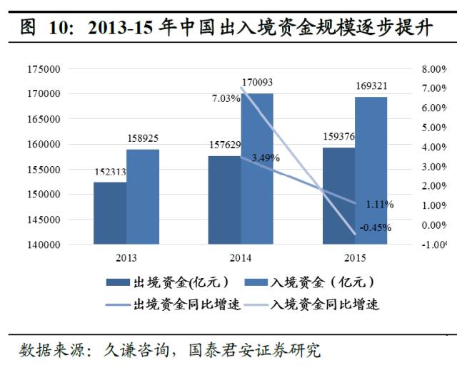 出入境资金流动规模不断扩大,跨境支付行业市场空间广阔。2015 年 我国出入境资金规模为 32.87 万亿元,较 2013 年同比增长 5.61%;其中出境资金规模为 15.94 万亿元,较 2013 年同比增长 4.64%;入境资金规模为 16.93 万亿元,较 2013 年同比增长 6.54%。