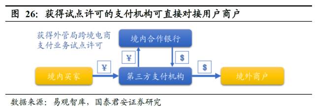 目前有两类企业可以从事跨境支付业务,一类是具有跨境支付试点牌 照的企业,可以直接对接买卖双方;另一类是具有汇兑资质的企业借 助第三方支付以及银行实现对接。我们预计未来产业链将逐步开启整 合,第二类企业通过向第三方支付端延伸打通产业链,跨境支付试点 牌照的壁垒将逐步减弱。