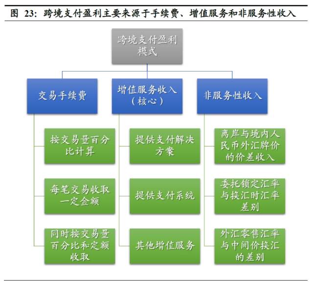 跨境支付盈利模式呈现多样化,主要来源于手续费、增值服务和非服务性收入。跨境支付作为第三方支出的海外市场应用场景的拓展,其盈利模式具备第三方支付的天然属性,增值服务收入是核心盈利模式,交易手续费是常规盈利模式,非服务性收入与外汇市场紧密相关。