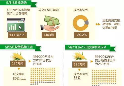 5月18日挂牌的400万吨玉米挂牌底价大约在每吨1300元左右,成交均价在每吨1409元,成交率达到89.2%,呈现高成交量、高溢价、高成交率的特征。