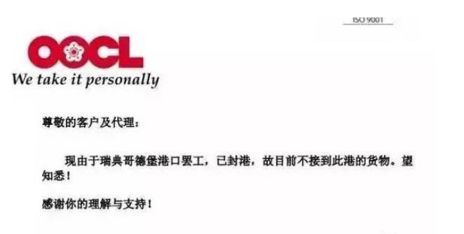 瑞典哥德堡的港口罢工愈演愈烈,直接导致港口已封港。近日,OOCL东方海外发布紧急通知,将停接到此港的货物。