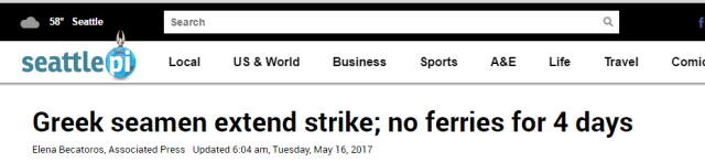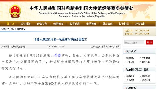 据《路透社》5月17日报道,希腊渡轮、巴士、火车服务、公务员和医生星期三(17日)在全国范围内罢工,以抗议希腊政府与国际债权人的援助协议中对社保和劳动市场法规的一系列改革!而且罢工还可能延续!