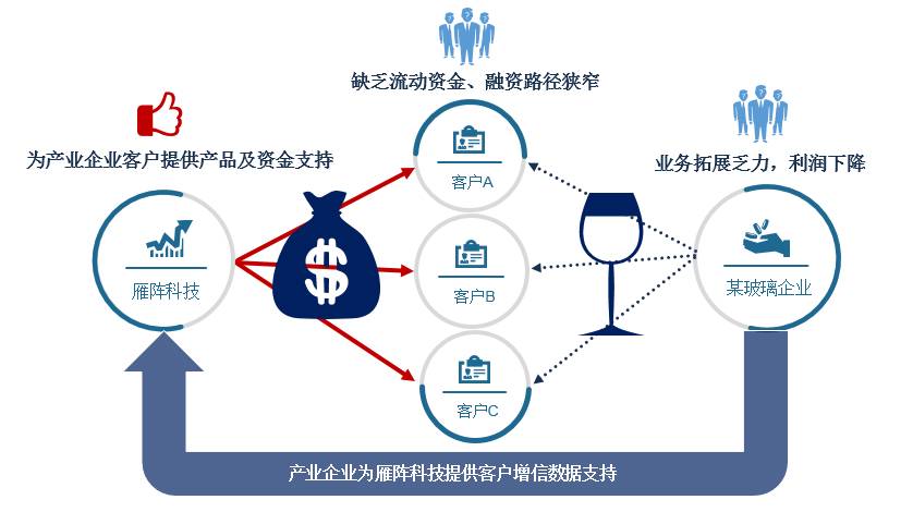 举一个玻璃企业的案例说明一下如何使用数据来控制供应链金融的风险。由于玻璃行业的不景气,这家行业前三玻璃企业的下游客户融资非常困难,没有钱周转和更新设备,而下游的不景气也导致这个企业的业务开拓乏力、利润下降。雁阵科技所做的事就是,把采集数据的点布置在切割设备的微处理器上,能够采集玻璃生产和切割的过程中的各类数据,通过这个手段,我们能够区分出A、B、C这几家企业谁的状况更好,会给相对状况更好的企业一个授信。从这个案例中,能够反映出我们的理念是,为企业客户提供产品和支撑服务,这个的基础来自于数据端,而不是来自企业或担保。总结起来,我们是通过数据,给好的企业他们所需要的资金,而这个资金成本,来自于周转效率的提高带来的增量收益的分成。