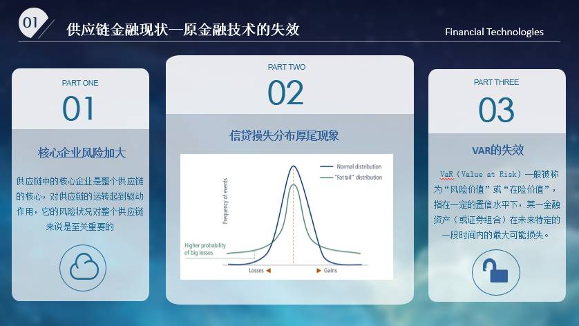 供应链金融能够发展到今天,货币供应是一个很大的原因,货币的绝对量还比较大,但是增速在减少,企业必须精耕细作,重视资金的周转速度,这是由外部环境发展所致。同时,市场上整体的供应环境发生变化,以钢为例,去年一年钢材的供应富裕1亿吨以上,有12%的钢生产出来要么出口要么被闲置,给业界造成了很大的压力。不仅钢铁,玻璃、石化产业都出现了这个情况,也从侧面解释了为什么供应链金融有这么大市场空间。此外,从金融内部来看,原有的金融控制风险已经失效。第一,核心企业的风险在加大;第二,信贷损失分布的厚尾现象越来越明显,出现大额巨量损失的可能性会增加;第三,VAR值基本失效。