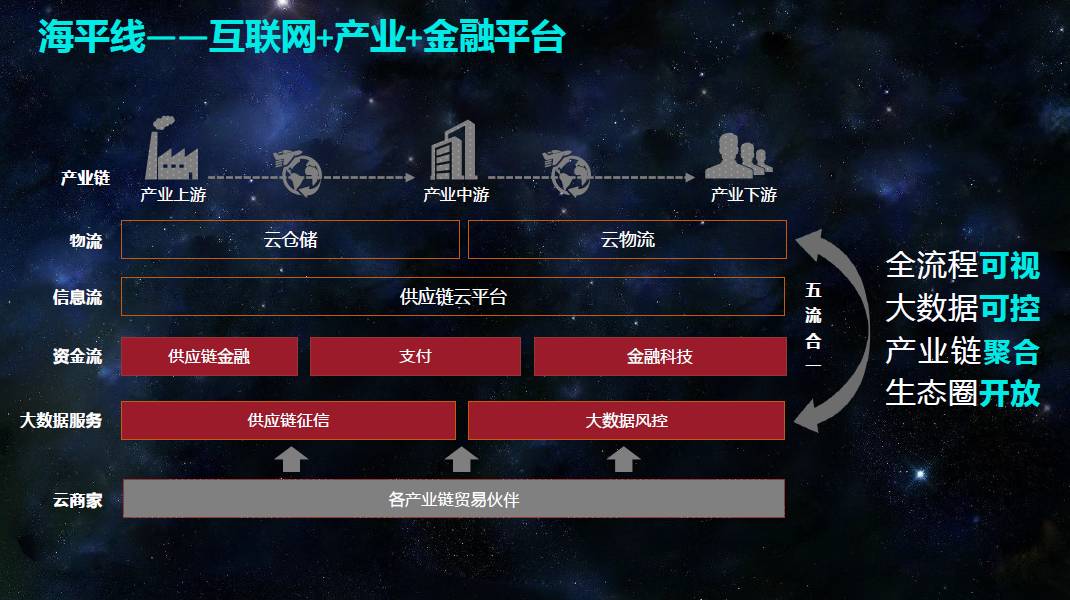 海平线是海航集团供应链金融的一个实践,海平线的商业模式分为五个层次,第一层是产业链,不论是核心企业还是上下游企业,都是产业链的一环,以前经常提N+1+N,那么现在海平线把它拓展成N+1+N+1+N,可以根据产业链进行延伸,海平线能够给企业提供什么服务,与与他在产业链中扮演的角色有关;第二层是物流层,我们为产业链上中下游打通集订单、仓、运、配于一体的供应链管理服务在第三层,海平线提供全套的SaaS化贸易管理平台,满足产业链对供应链的全程可视化管理需求;第四层是资金层,包括供应链金融服务、支付、金融科技,我们以金融科技为手段、以支付结算为工具为产业链提供供应链金融服务。;第五层的大数据服务是整个金融平台的核心,分为供应链征信和大数据风控,海平线可以针对系统上的贸易数据、物流数据、支付数据等进行数据分析,为我们的金融服务提供供应链征信以及大数据风控,通过对资产端的整合,同时引入保险、担保等第三方服务机构,我们可以平台用户提供多样化的资金服务,我们通过对行业的商流、物流、信息流、资金流的整合,为用户提供全方位的供应链生态服务。这样就形成一个完整的闭环,所以重回到主题,不做产业的话,供应链金融的数据从哪里来。