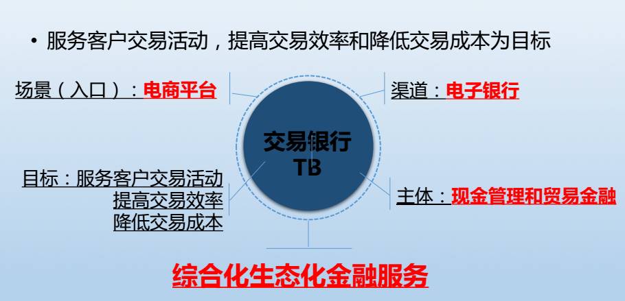 交易银行是为企业交易提供银行服务,随着社会的发展,交易银行的业务概念越来越丰富,直至现在,交易银行是以提高交易效率和降低交易成本为目标的综合化生态化金融服务机构。可以实现不同业务的深度融合,发展供应链电商和供应链现金管理。