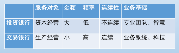 交易银行与投资银行有很大的区别,两者对比如下图: