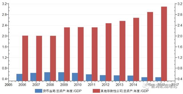 有人会把商业银行缩表和央行缩表拿来作对比,以此说明央行缩表是商业银行缩表的根源,甚至钱荒也是央行缩表引发的,其实两者并无绝对关系。事实上和海外相比,中国央行的缩表早早地走在了前面。过去几年可能有很多看法认为央行在扩表,但实际上央行总资产占GDP的比例是连年下降的,而商业银行总资产占GDP的比例则是越来越大,这还没有算银行的表外资产。