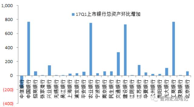 图6:2017年1季度24家上市银行资产环比变化(单位:十亿元)