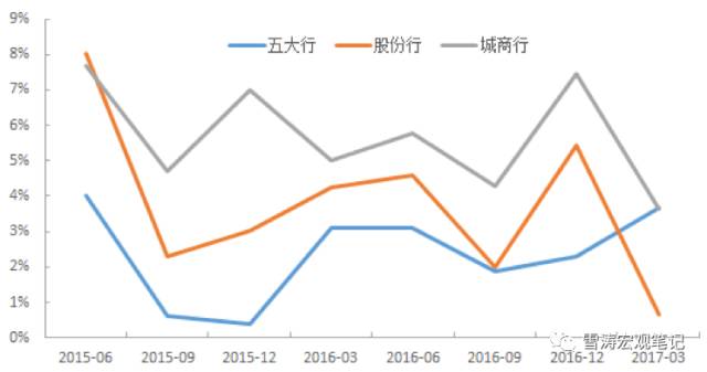 17年1Q,五大行的资产环比增速上升至3.7%,股份制的资产环比增速下降至0.7%,城商行的资产环比增速下降至3.6%。可见去年下半年逐渐加强的金融监管对银行业的资产负债表产生了结构性影响。
