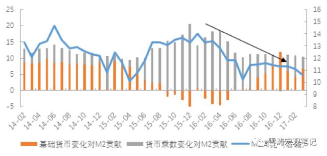 图4:2016年以来货币乘数对M2增速贡献度不断下降