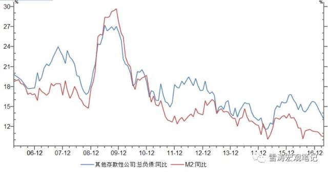 2011-2013年和2014-2016年,M2增速和银行总负债增速之间总会有4-5个点的差距。前后两个3年间,中国的货币信用创造发生了变化,在M2以外还有一个货币创造的发动机,就是银行的资产负债表。前一个3年对应了银行配置非标的扩张,后一个3年对应了银行同业的扩张。13年6月,央行控制银行期限错配打压非标之后,银行总负债的增速迅速向M2增速收敛,这次可能还是一样收敛。最近发布的《2016年理财年报》显示2016年理财产品余额从23.5万亿上升到了29万亿元,但增速明显放缓。